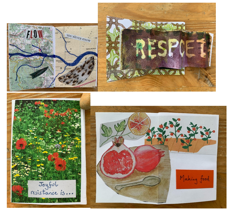 These questions stayed with me across the days. During our discussions, I shared and reflected more on my recent work with the FEELed Lab and how those insights and practices might support our work in the Collective. We use zines a lot in the FEELed lab and on our last evening of the retreat, we also created some zines. Each zine had a unique vibe and style including drawing, collage, gelliprints and focusing on its own theme. The themes that have stuck with me the most are ways of joyful resistance, going with the flow and respect.